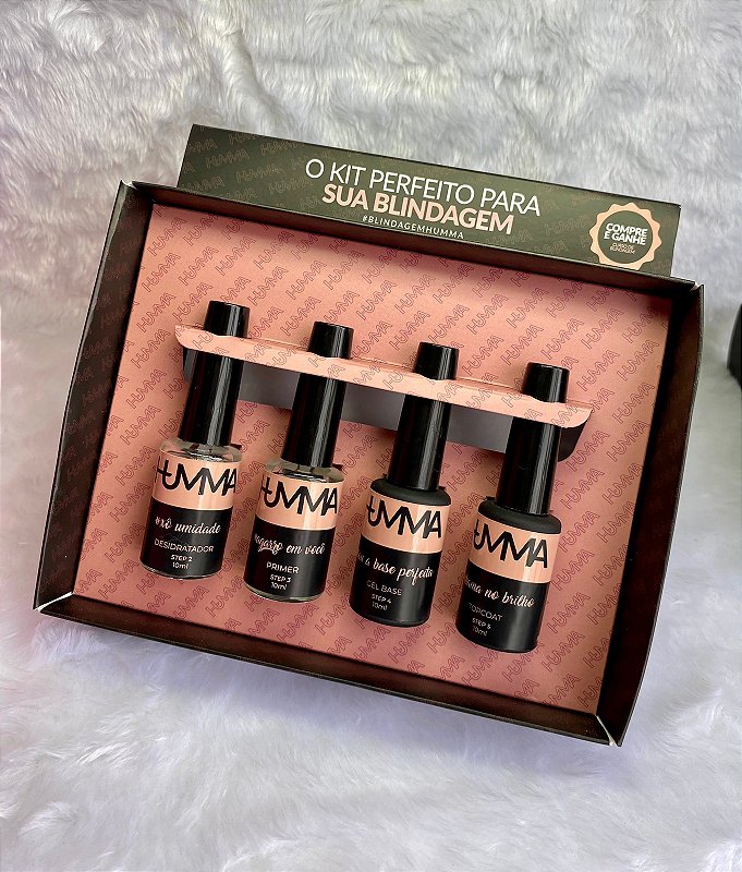 O Kit Blindagem Humma vem com 4 passos básicos e necessários: desidratador, primer, gel base e top coat com glitter.Xô Umidade é o desidratador de unhas, indicado para desidratar e remover toda a oleosidade. Possui função adstringente e desengordurante, promovendo a adesão perfeita do primer e dos géis.Agarro Em Você é o adesivador que promove ao gel uma aderência maior a lâmina, evitando descolamentos e infiltrações. Possui adição de ácido metacrilato na composição, oferecendo perfeita adesão de todos os géis e em qualquer tipo de lâmina, até para as mais oleosas.Sou A Base Perfeita é a base em gel que garante maior aderência entre a unha e o gel. Utilizada também nas blindagens e esmaltações em gel, proporciona estrutura resistente de forma a evitar rupturas, manchas e descamações, resultando em unhas perfeitas e duradouras. Seu aplicador em formato pincel traz praticidade e agilidade em mesa, além de evitar desperdícios aplicando a quantidade ideal para utilizar.