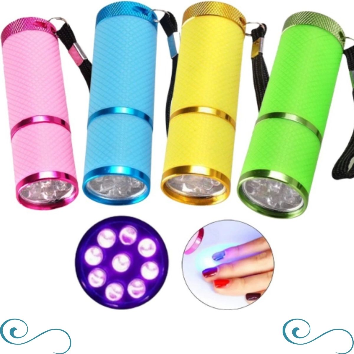 Mini lanterna com 9 leds ultravioleta indicada para a secagem de unhas em gel e produtos UV, possibilitando a secagem de uma unha de cada vez. Além da secagem de unhas, possui diversos usos como a verificação de cédulas, cartões de crédito, visualização de tinta fluorescente invisível, vidros rachados, entre outros.